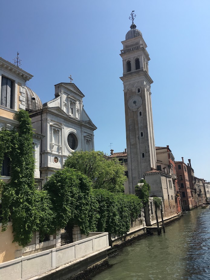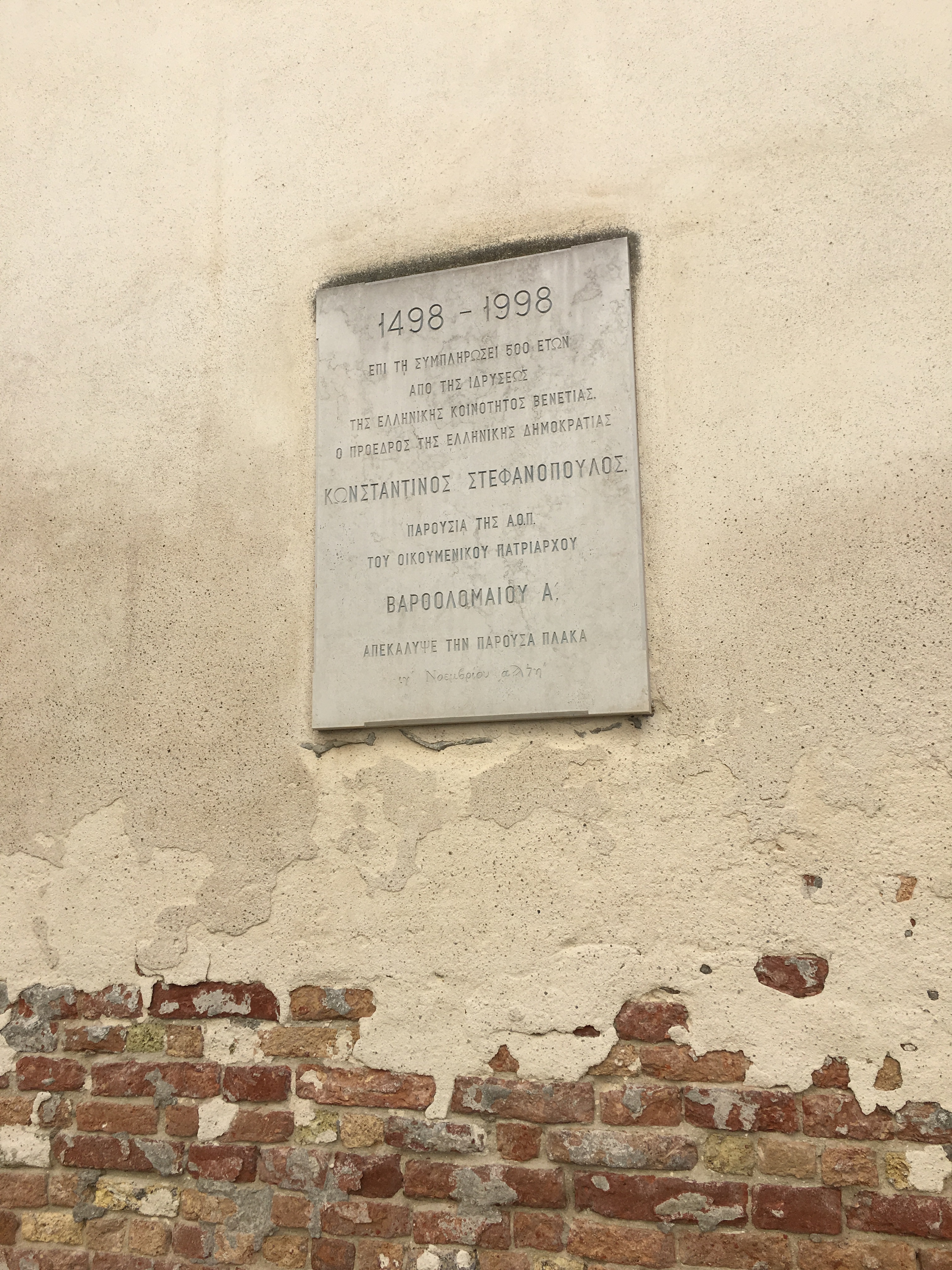 Even before the fall of Constantinople to the Ottomans in 1453 the Greek community in Venice was growing steadily. The Venetians dominated the seas in the Adriatic and Ionian Seas. There was constant movement of ships, cargoes and people. Venice controlled the island of Crete from 1205, Corfu from 1386 and Cyprus from 1489. By the end of the 15th century the Greek community in Venice numbered at least 4000 people. In 1498 the Greek population were given permission to create their own ‘scuola’ or guild hall as a meeting place and centre for preserving Greek culture and heritage. This new building was known as The Scuola dei Greci. The Scuola funded the construction of the church of San Giorgio dei Greci which is easily identified today by it’s elegant and rather tilted, leaning tower.