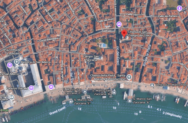 San Giorgio dei Greci (left and centre), location of ‘Little Greece’ in Venice focused around San Giorgio Church (right)