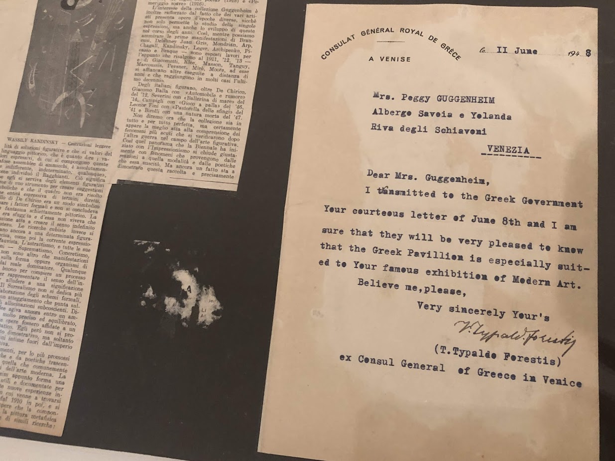 IN 1948 PEGGY GUGGENHEIM was invited to display her private collection of modern art in the Greek Pavilion at the Venice Biennale. This was just after the Second World War. At the time Greece was engulfed in a civil war (1946-1949) and was not in a position to provide art for the event. So instead Peggy Guggenheim was invited to display her already famous collection in the Greek Pavilion. A letter to Peggy, dated June 1948 was on display at The Guggenheim, Venice a few years ago (see below). The Greek Pavilion is still standing in the gardens of the Biennale in Venice – it was built in the 1930s.