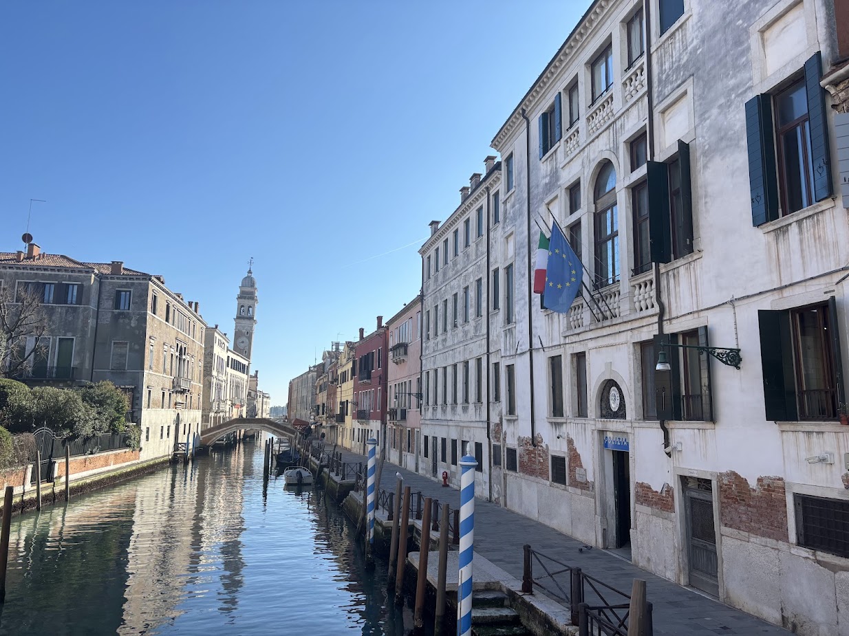 A GREEK community grew up in Venice, just inland from the Riva degli Schiavoni. They built their own church here San Giorgio dei Greci, which still exists to this day. The church is an elegant white stone building with a magnificent campanile or bell tower that leans at a jaunty angle, a bit like the Leaning Tower of Pisa. Next door to the church is the former Bishop’s residence and the Hellenic Institute, where you can visit the Greek Museum and Library. You can also sign up for Greek language classes. To complete the picture the blue and white stripes of the Greek flag billow in the breeze.
