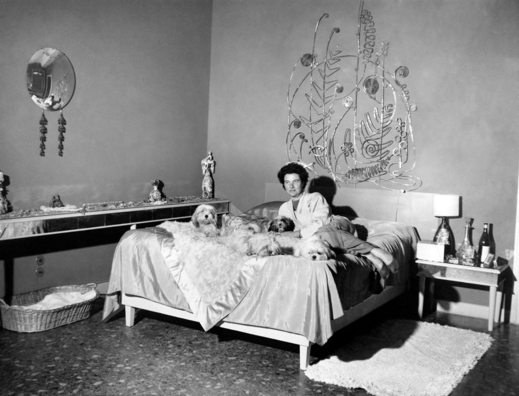 Kandinsky painting ‘Courbe Dominante’ 1936 will be on display in Venice. Right, Peggy at home with the doggies.