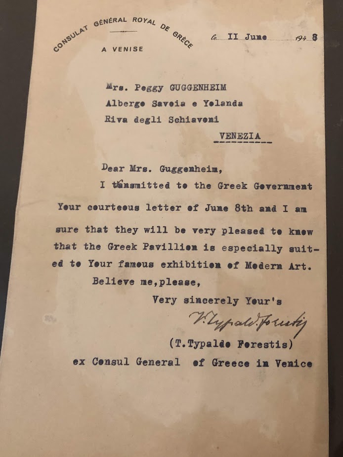 Letters above (The Guggenheim, Venice) June, 1948 discuss Peggy’s collection being shown at 1948 Biennale – Peggy in Delphos Gown, designed in Venice