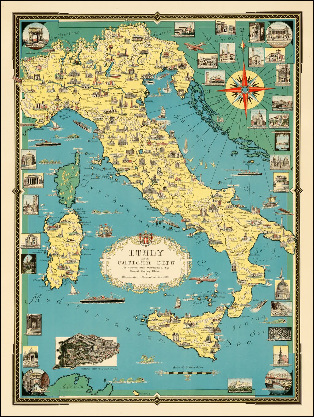 This is the magnificent original of the 1905 map. It shows so clearly the mountains, in shades of brown and beige, depending on their altitude. Then the plains in green. The Adriatic Sea is a relatively shallow sea, coloured in very pale blue. In fact over time (thousands of years) it will eventually silt up. Whilst the Mediterranean to the west is very deep. The Med is, in fact a tectonic basin and thousands of fathoms deep at its deepest point. So the colouring here is a rich turquoise blue.